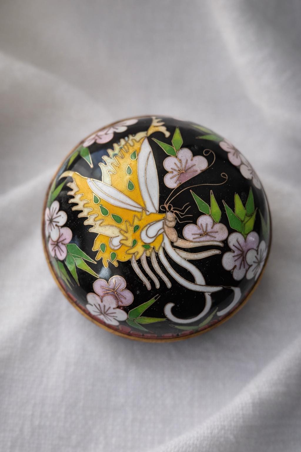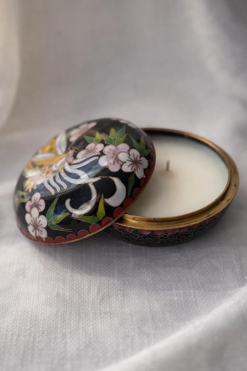 Poured into an exquisite Japanese trinket box, this piece is rich with contrast and detail-black, yellow, pink, and green intertwine to form a dreamlike nocturnal garden. At its heart, a golden yellow butterfly floats effortlessly among blush pink flowers, suspended in the stillness of night. Open the lid to reveal a blue and gold patina interior, glowing softly when lit, adding an unexpected layer of depth and luxury.