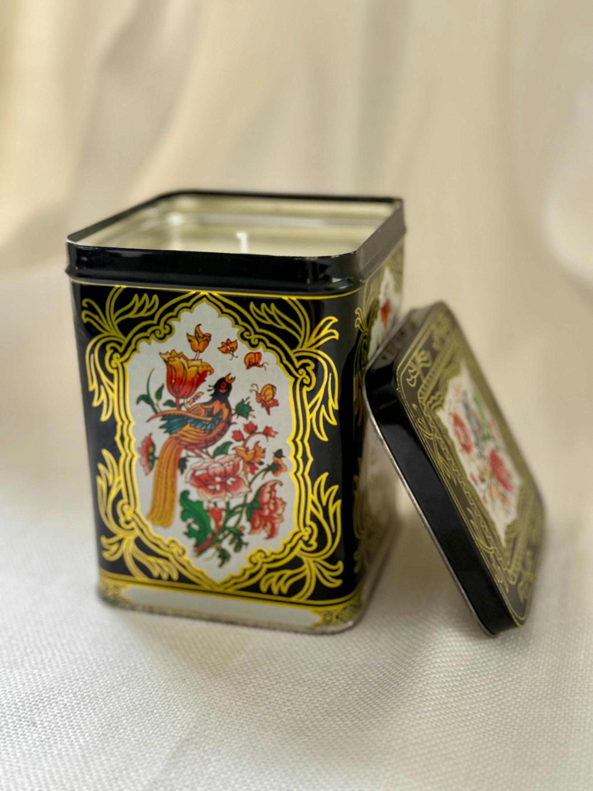 Wild Rose Tea Tin Candle | Floral & Exotic Bird Design with Gold Accents